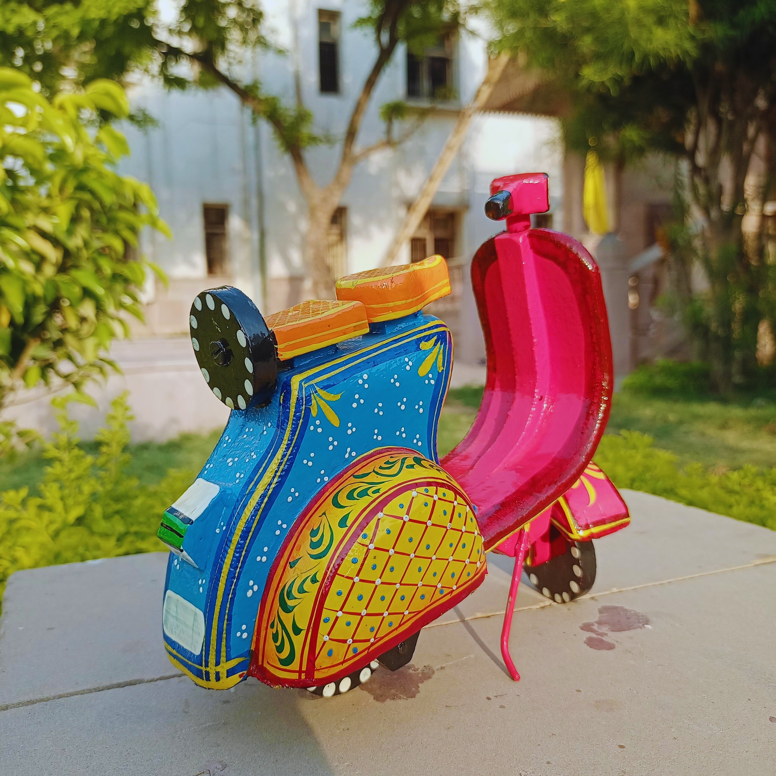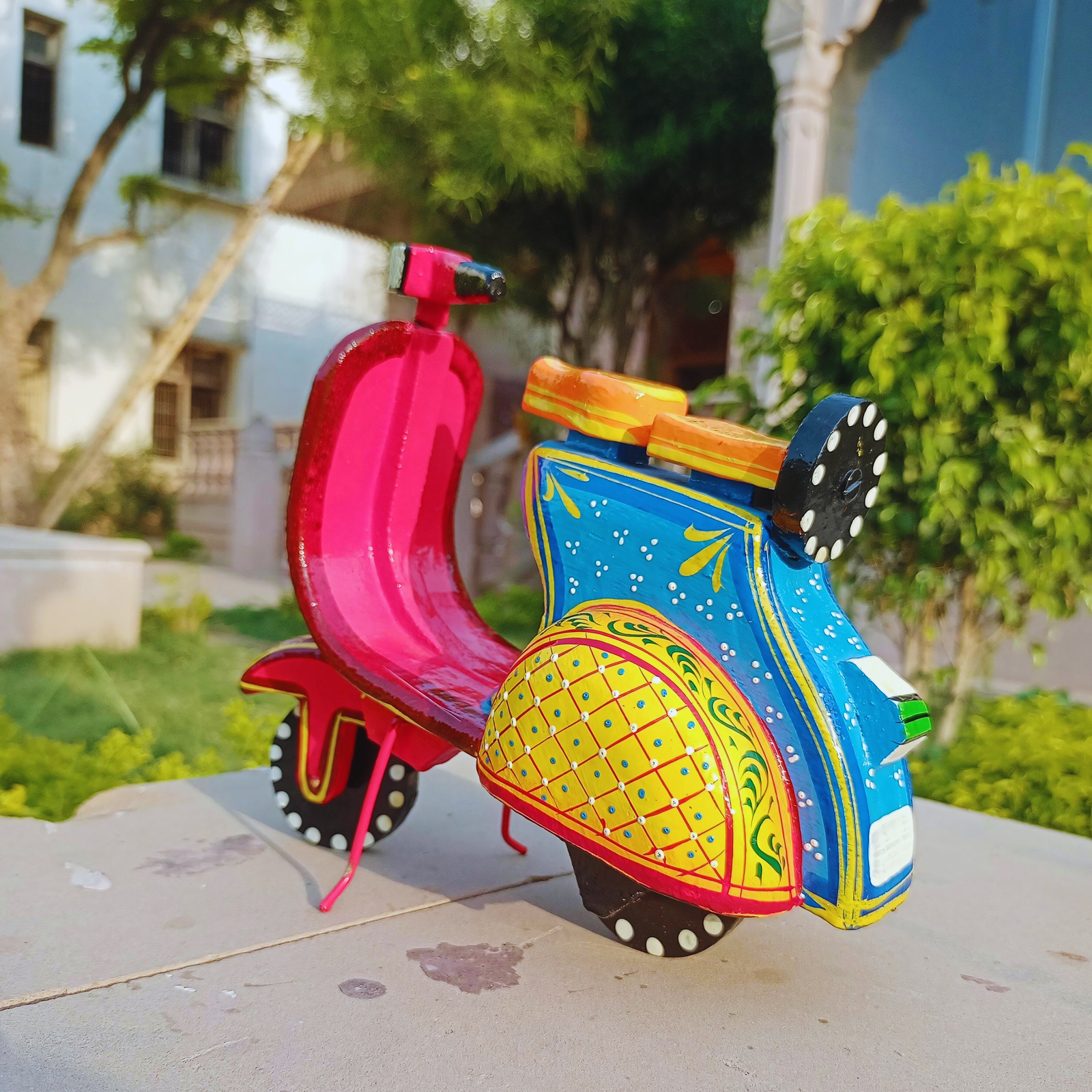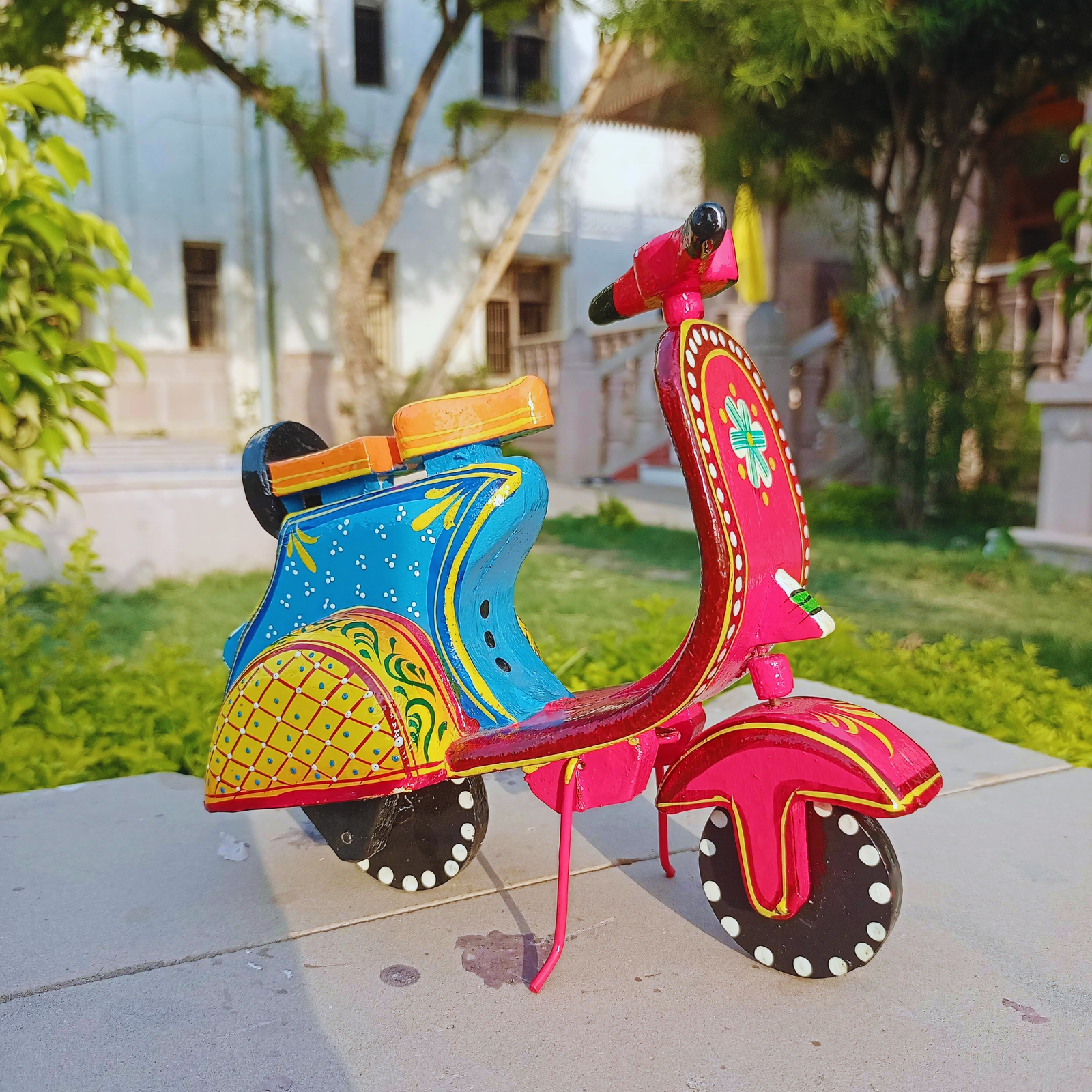 The Rangyatra Hand-Painted Wooden Scooter is a charming decorative piece featuring intricate hand-painted designs. Made from high-quality wood, this miniature scooter adds a playful and artistic touch to any room. Perfect for home decor or as a unique gift, it showcases traditional craftsmanship with a fun twist.