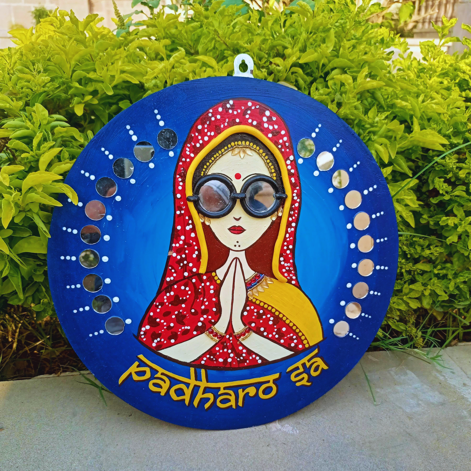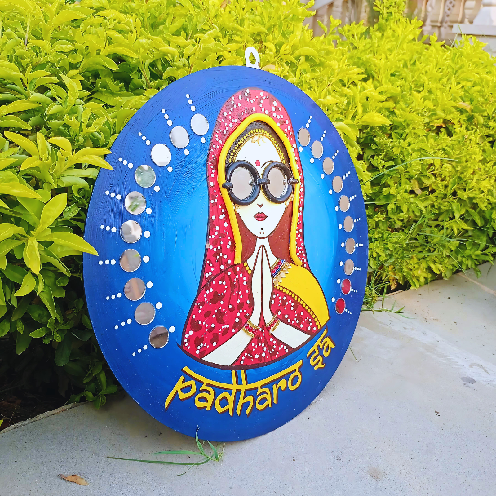 The Rangyatra Hand-Painted Wooden “Padharo Sa” is a beautifully crafted decorative piece featuring traditional artwork. This wooden plaque, adorned with vibrant hand-painted designs, warmly welcomes guests with the Rajasthani phrase “Padharo Sa,” meaning “Please Come.” Perfect for adding a touch of cultural elegance to your home decor.